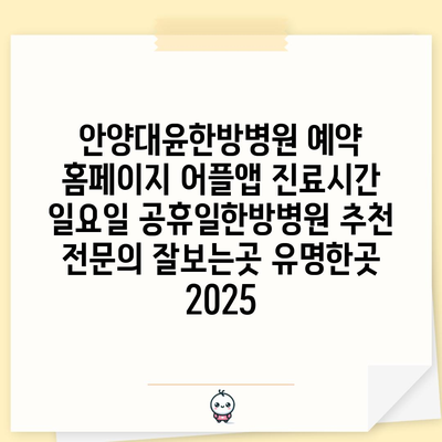 안양대윤한방병원은 고객의 편리함을 위해 예약 홈페이지와 어플앱을 운영하고 있습니다. 진료시간은 주중은 물론, 일요일과 공휴일에도 운영되어 많은 환자들에게 사랑받고 있습니다. 한방 …